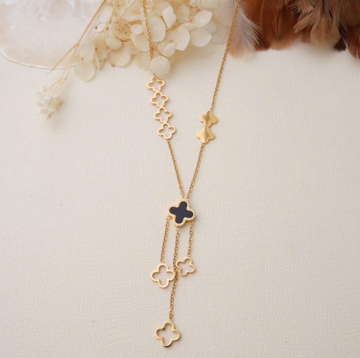 Bär detta fyrklöver halsband som har en mer attraktiv design och är tillverkad av 18 k guldpläterad rostfri material och som ger dig en känsla av guld och är dessutom vattentålig.